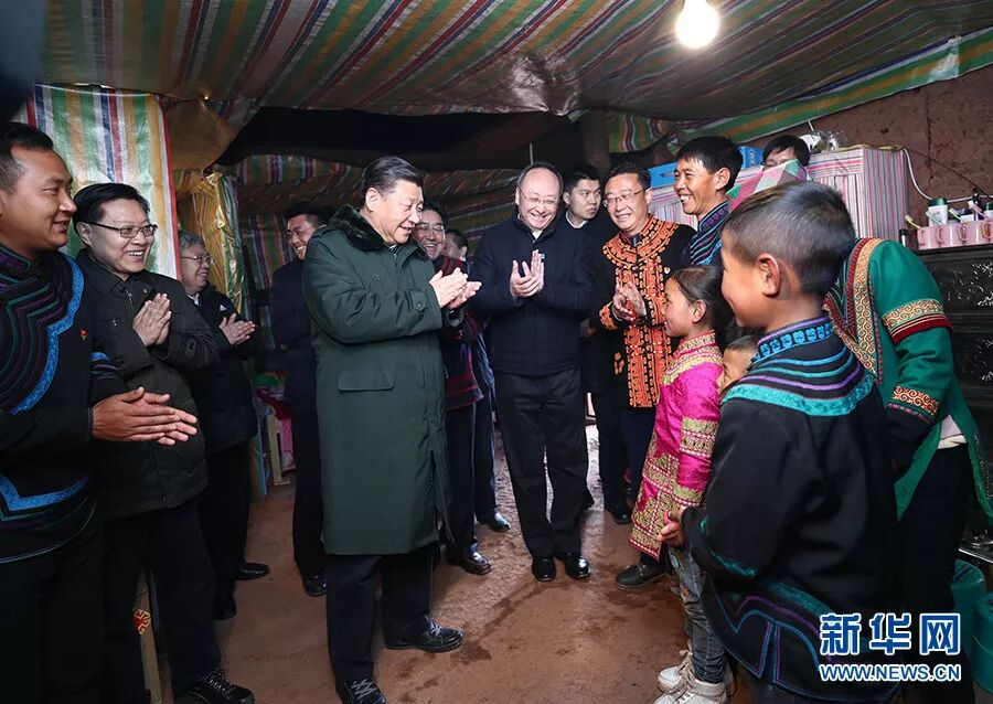2018年2月11日,农历春节来临之际,习近平在四川凉山彝族自治州昭觉县三岔河乡三河村贫困户吉好也求家中看望,听10岁小女孩吉好有果唱《国旗国旗真美丽》。新华社记者 鞠鹏 摄