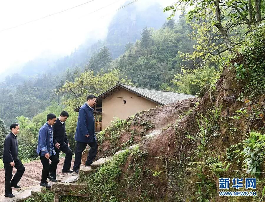 2019年4月15日,在重庆石柱土家族自治县中益乡华溪村,习近平踏着湿滑的石阶登上陡坡,前往贫困户谭登周家看望。新华社记者 谢环驰 摄