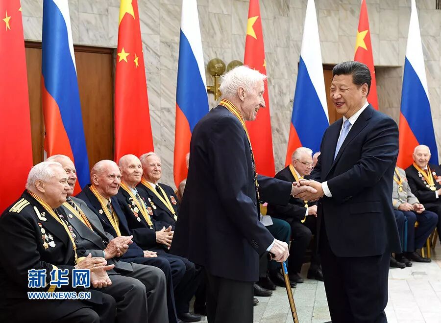 2015年5月8日,习近平在莫斯科会见曾在中国东北抗日战场上和卫国战争中浴血奋战的18名俄罗斯老战士代表。新华社记者 饶爱民 摄